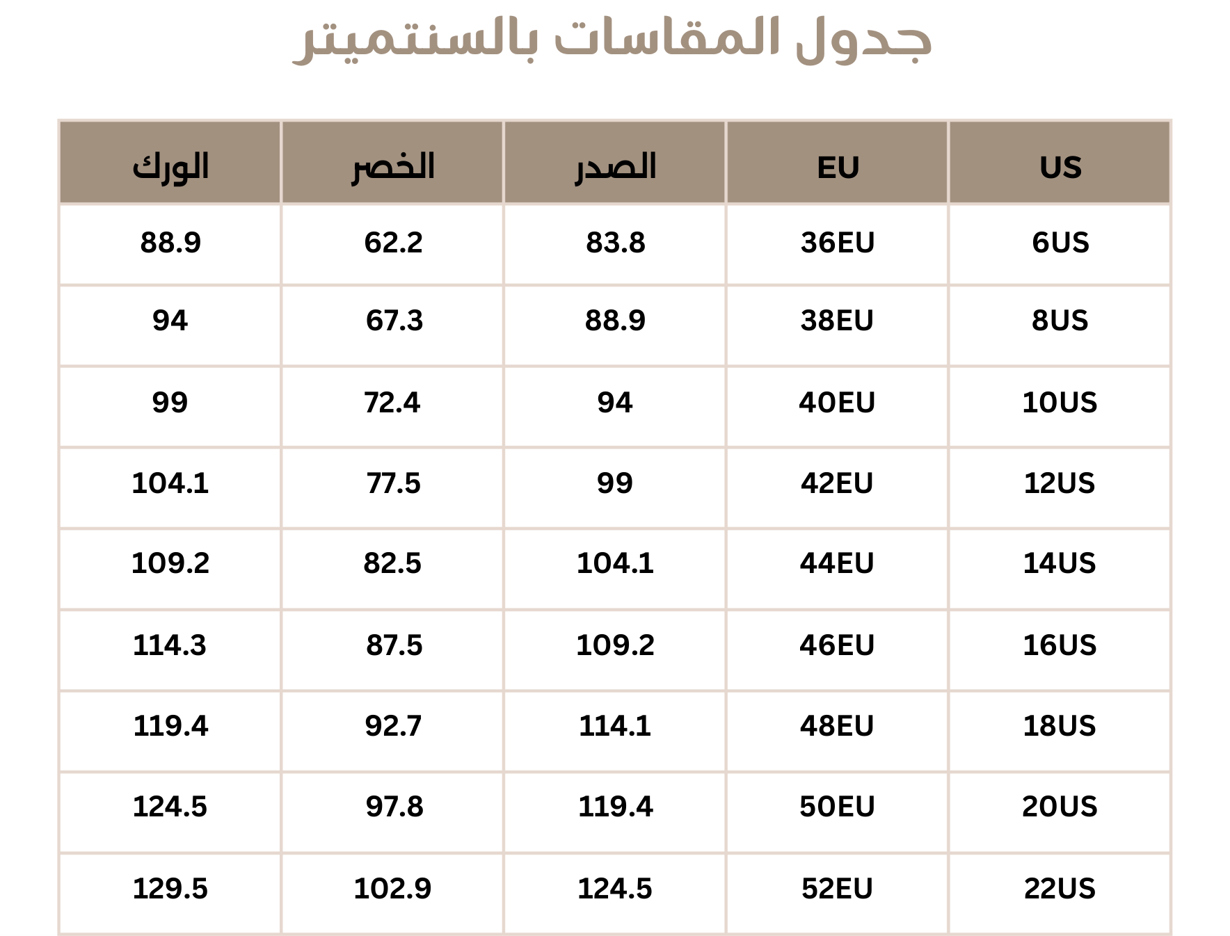 الخصر : يجب اخذ القياسات من محيد منطقة الخصر وهي أضيق منطقة في جذعيك ,مع إبقاء شريط القياس متوازياَ للأرض وإتاحة مجال بقدر اصبع ما بين شريط القياس وجسدك.